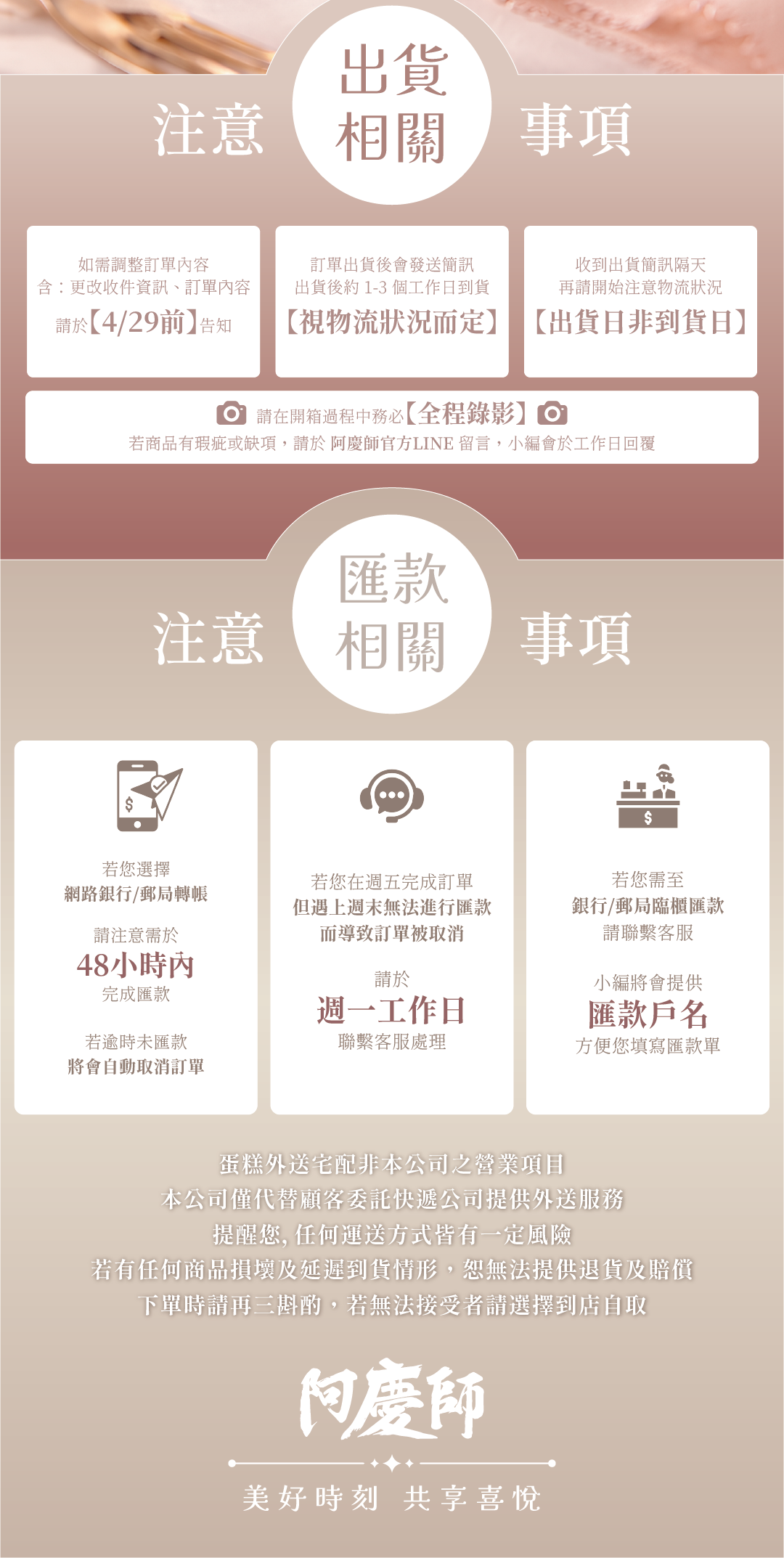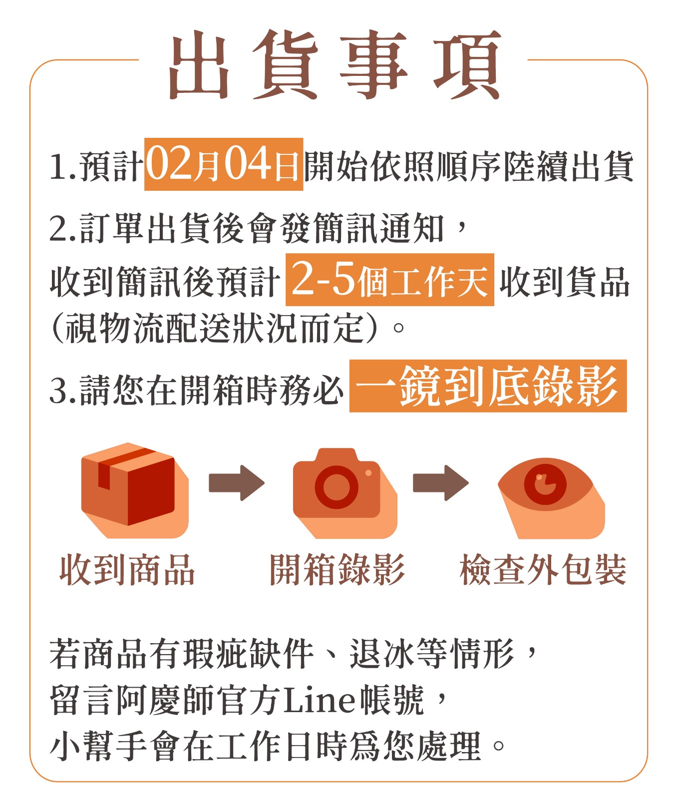 常溫宅配,已開始依照訂單順序「陸續出貨」(不含週休及國定例假日),出貨時簡訊通知,麻煩您留意手機簡訊。